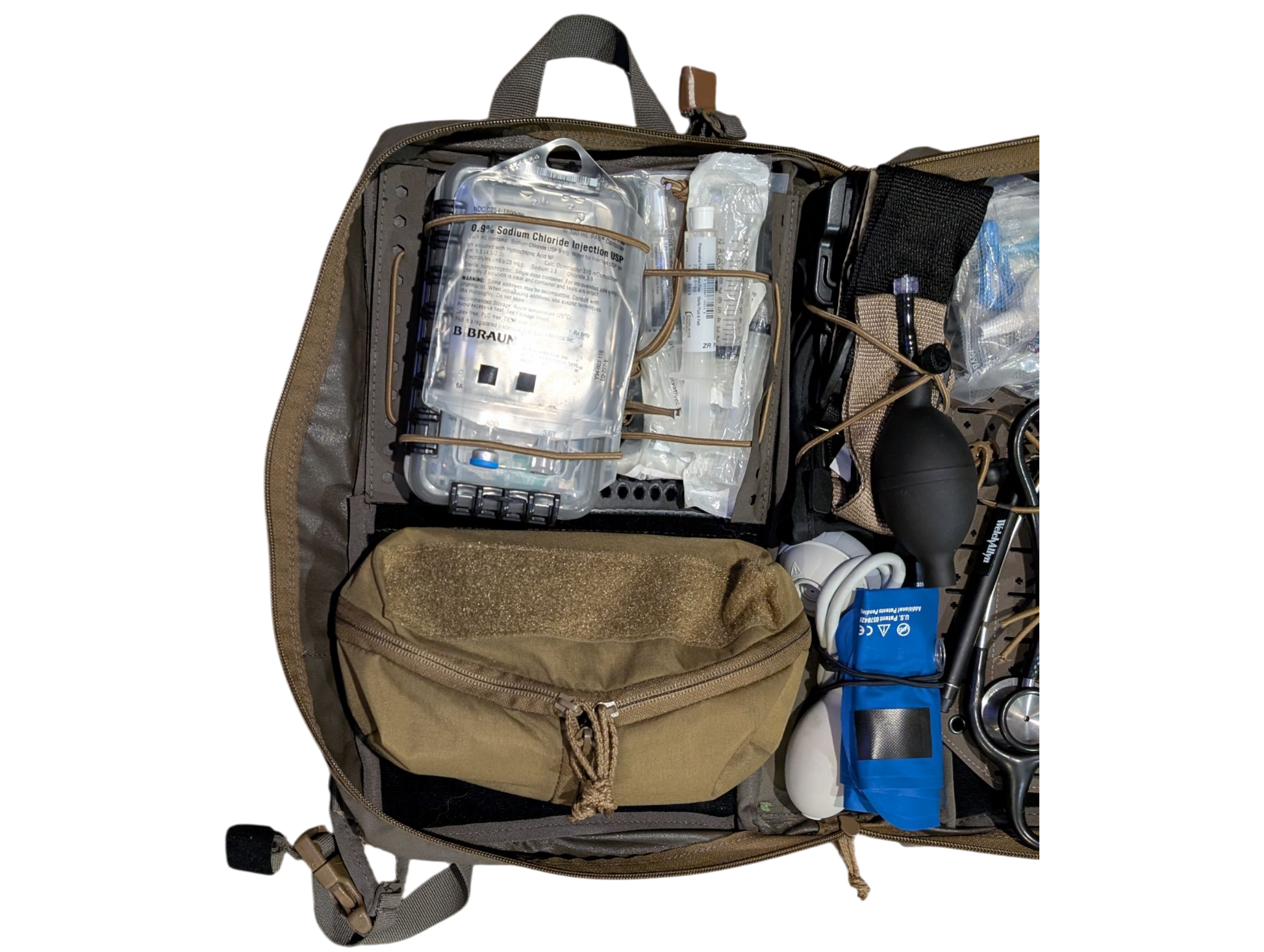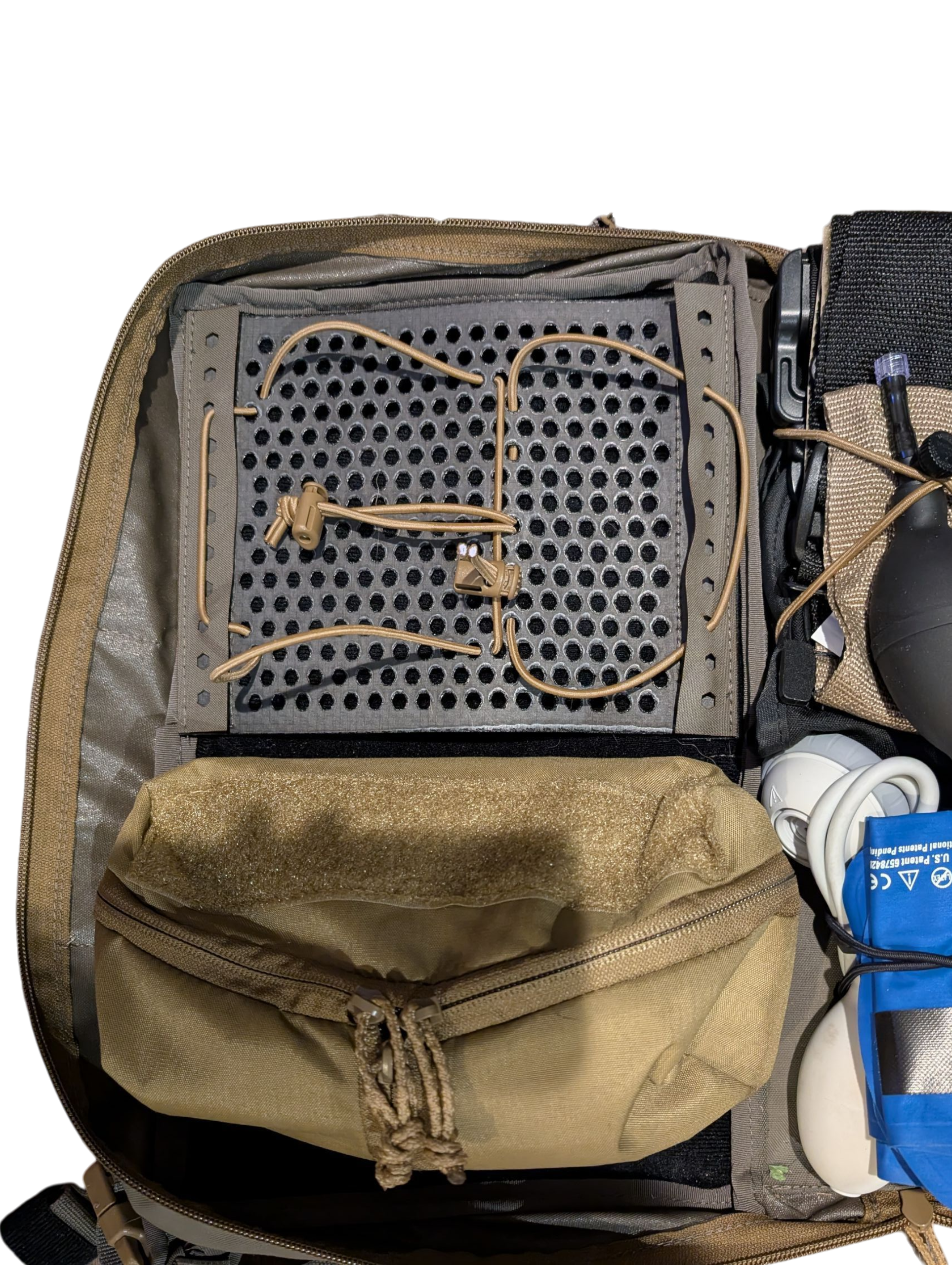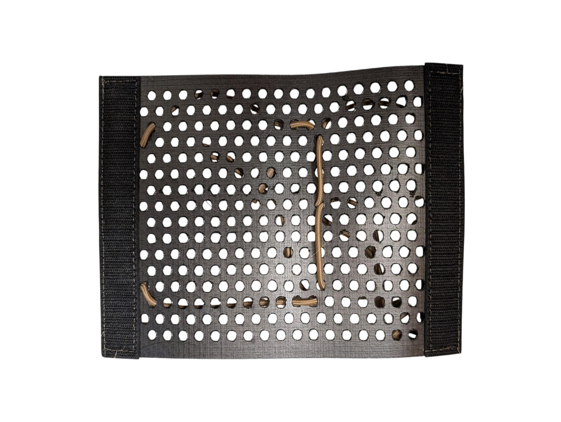 The ADPT (adaptable) Inserts are 7" x 9.5". The main panel is made from Curv with hexagon holes allowing for shock cord to be woven throughout. Each side has laminate shock cord retainers to allow for depth on the panel. Lastly the main panel is backed with hook Velcro, so it can be attached to our Line 1.5 Medical Bag or similar bags from other companies. While originally designed to hold medical equipment and gear, these inserts can also hold office supplies, outdoor gear, and more. This insert provides an organized way to hold your tools the way you want while also providing a method to quickly remove your gear from your bag while still keeping everything together.