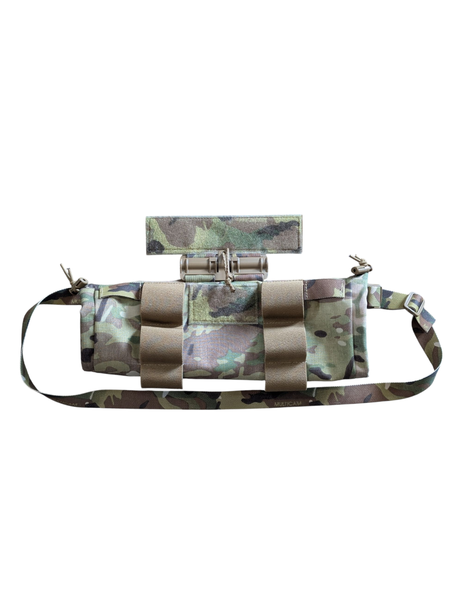 The BSB Pouch is a 13" x 15" (when full) burrito style pouch with 2 bands of 2" elastic wrapping around the outside. Each elastic band creates 5 cells for holding equipment. Centered in the front is a loop Velcro rectangle where various patches can be attached. The inside of the pouch can be cinched shut via a shock cord and cord lock method to avoid loss of gear. The pouch itself can attach to plate carriers or belts (such as a gun belt or belt kit) by a mounting panel that has both hook and loop Velcro sides. The panel is attached to the pouch itself by first spear tubes allowing for a quick release off your person when needed. The BSB Pouch also features a removable waist strap, so it can be worn in a fanny pack configuration. The strap can also be used to better secure the pouch to your person when attached to a plate carrier.
